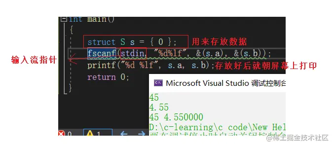 fscanf(stdin, "%d%lf", &(s.a), &(s.b));