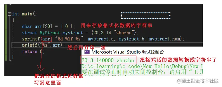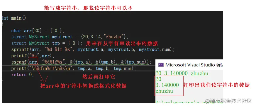 struct MyStruct mystruct = {20,3.14,"zhuzhu"};