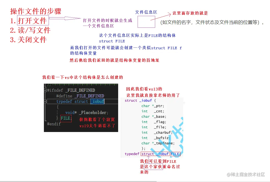 每个被使用的文件都在内存中开辟了一个相应的文件信息区,用来存放文件的相关信息(如文件的名字,文件状态及文件当前的位置等)。这些信息是保存在一个结构体变量中的。该结构体类型是由系统声明的,取名FILE.