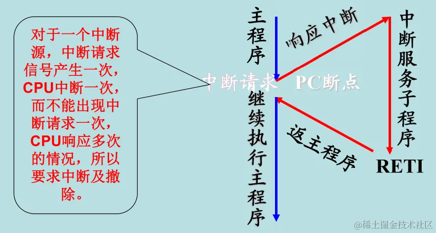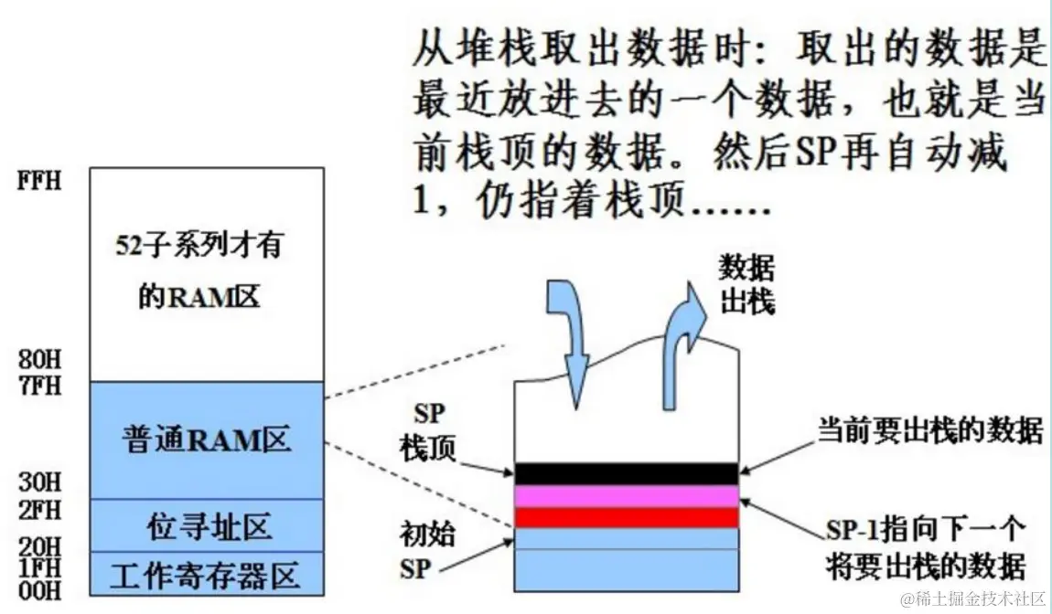 3.子函数调用,中断响应过程:调用子函数、处理中断响应的时候,程序计数器 PC 的值以及相关数据会先压入堆栈,然后去处理子函数、中断服务。处理完了,再从堆栈中读取 PC 和相关数据,继续执行断点后面的程序。