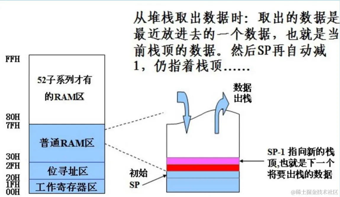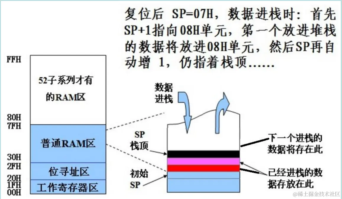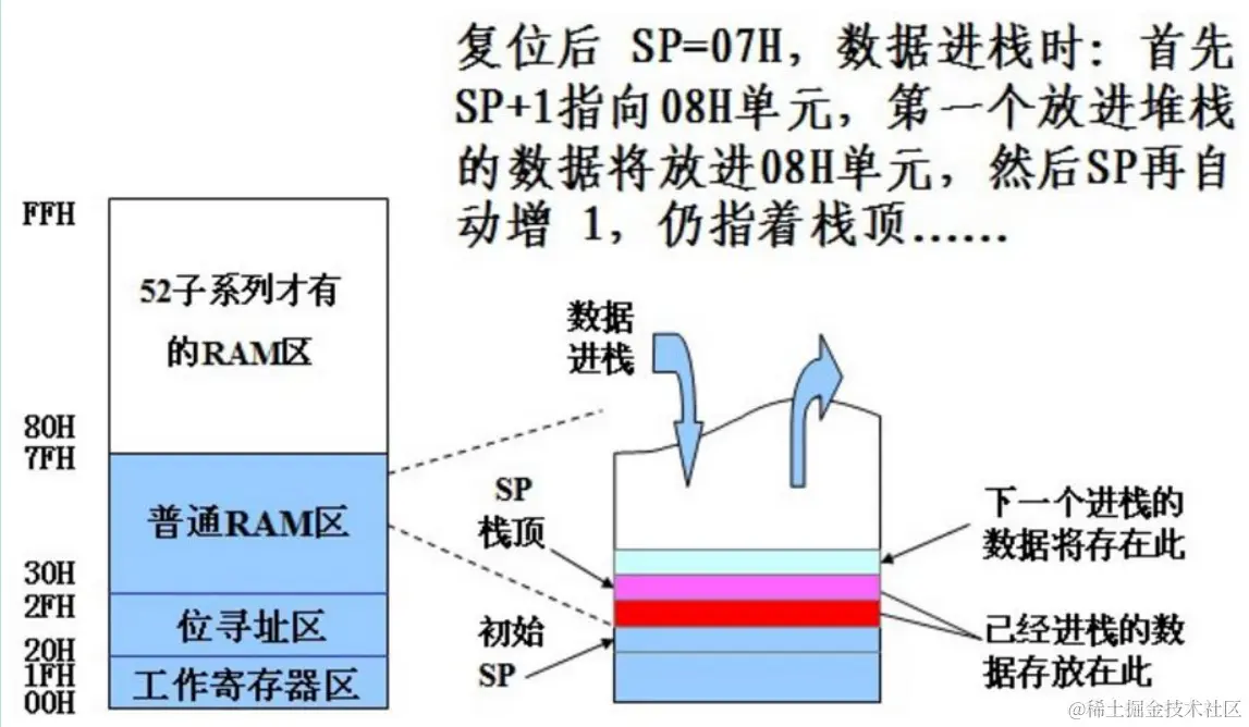 2.堆栈:堆栈是单片机 RAM 存储器的一个特殊区域。通过 SP 堆栈指针寻址。按顺序存取, “ 后进先出 ” 。复位后 SP 初值是