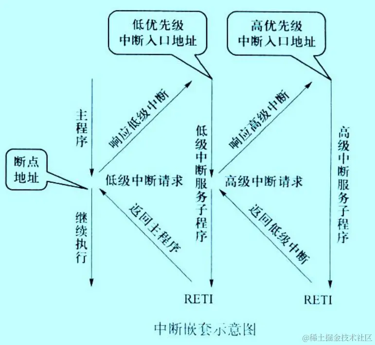 STC单片机通过配置IP和IPH寄存器,来决定每个中断的优先级别,避免中断级别错误导致的产品缺陷,高级中断不会自动直接返回到主函数,高级中断完成后,继续完成低级中断的任务,最后所有中断处理都完成了,才能回到主函数的断点位置,这也是堆栈的后进先出原则。