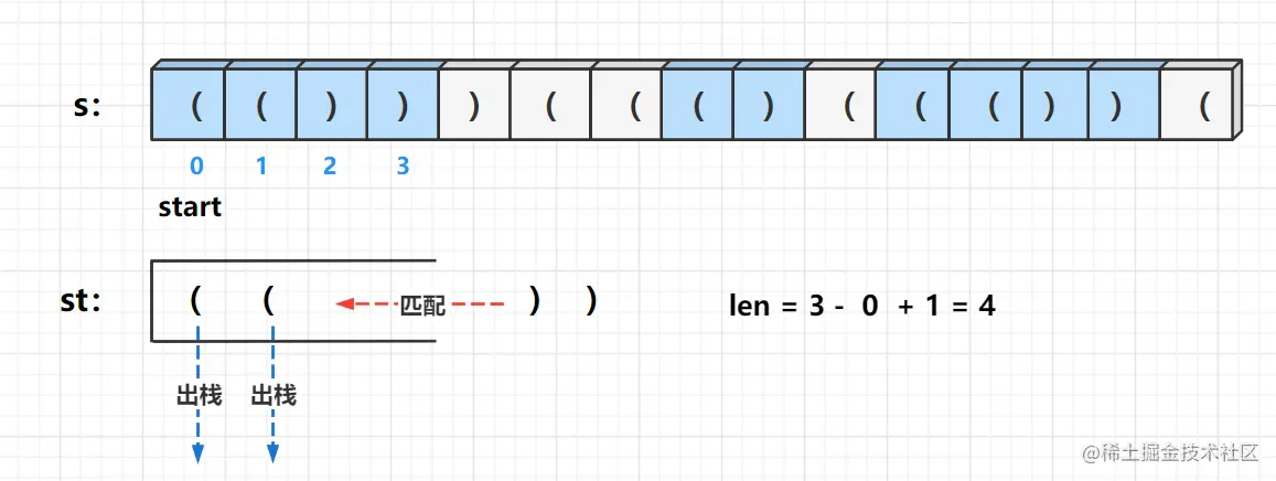 )且当前栈为空,则当前的start开始的子串不再可能为合法子串了,下一个合法子串的起始位置是i + 1,更新start = i + 1。 -