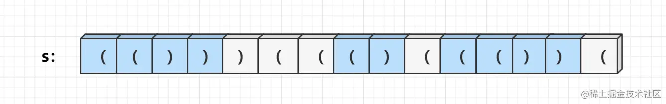 我们可以发现一个规律,每一段合法括号序列它在字符串s中出现的位置一定是连续且不相交的,如下图所示: