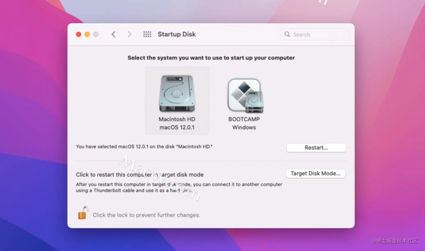 - 单击挂锁并输入 Mac 的管理员密码(或使用 Touch ID)以更改启动首选项。