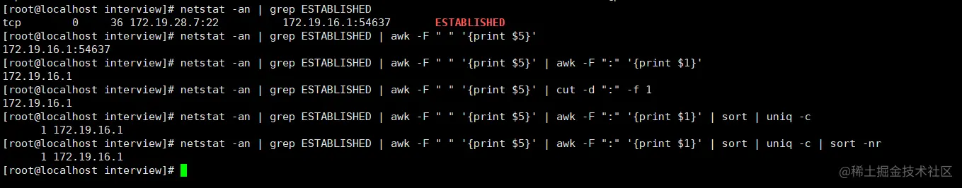 答案:netstat -an | grep ESTABLISHED | awk -F " " '{print $5}' | awk -F ":" '{print $1}' | sort | uniq -c | sort -nr