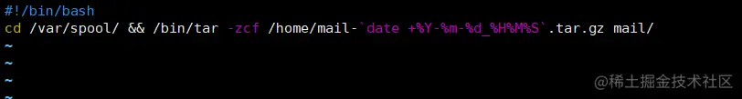 # /bin/tar -zcf /home/mail-`date +%Y-%m_%H%M%S`.tar.gz mail/: 将/var/spool/mail目录打包并命名为mail-`date +%Y-%m_%H%M%S`.tar.gz,然后放置到/home目录下