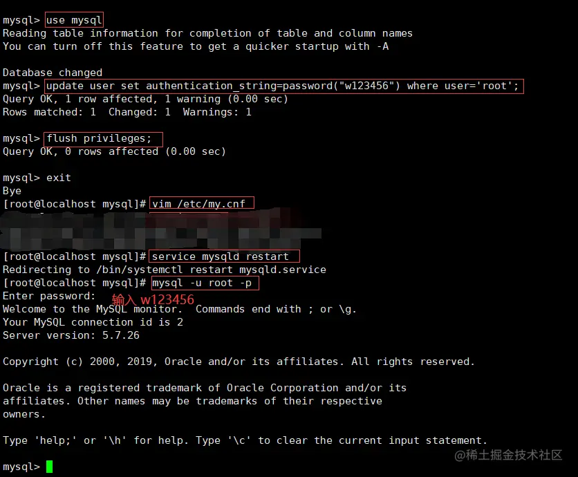 use mysql:记住是在 mysql 数据库(自带)update user set authentication_string=password("w123456") where user='root';:重新设置自己的 Mysql 密码flush privileges;:刷新权限(一定要执行,可理解为使得重置密码生效)vim /etc/my.cnf:注释掉skip-grant-tablesmysql -u root -p:重新根据密码登录