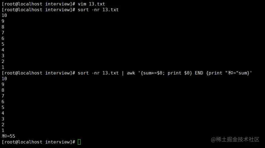 sort -nr 13.txt) 就是要将其排序后的结果输出,所以在awk '{sum+=$0}'统计的同时还要加上print $0,即awk '{sum+=$0; print $0} - 输出总和: