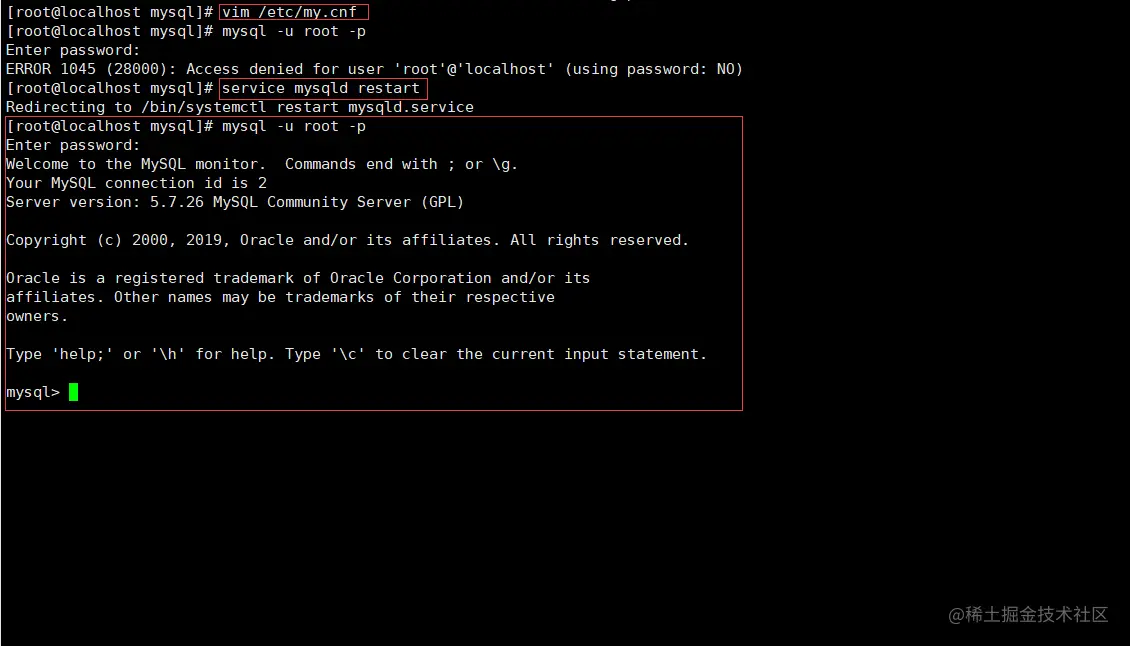 2、service mysqld restart、mysql -u root -p、然后 enter 直接进入: