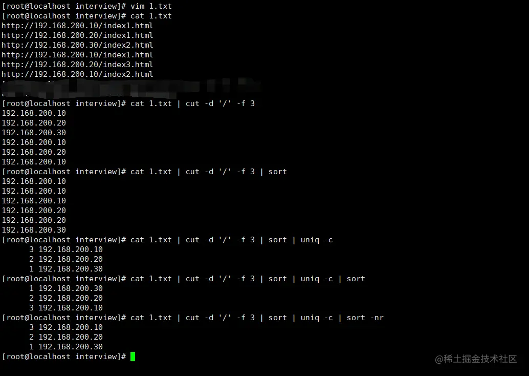 答案:cat 1.txt | cut -d '/' | -f 3 | sort | uniq -c | sort -nr
