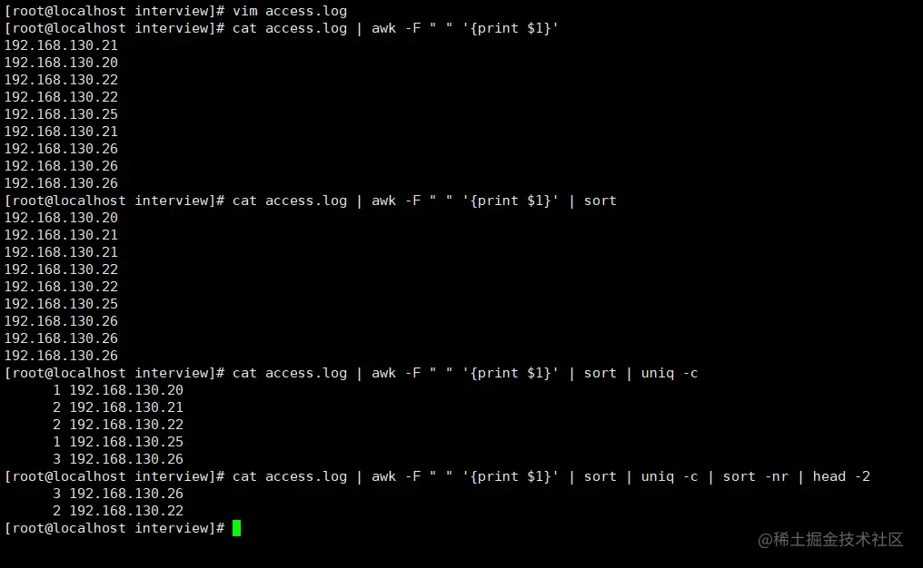 答案:cat access.log | awk -F " " '{print $1}' | sort | uniq -c | sort -nr | head -2