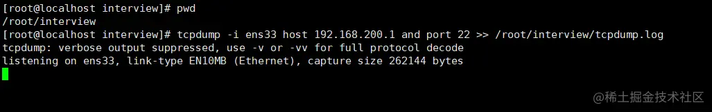 答案:tcpdump -i ens33 host 192.168.200.1 and port 22 >> /root/interview/tcpdump.log