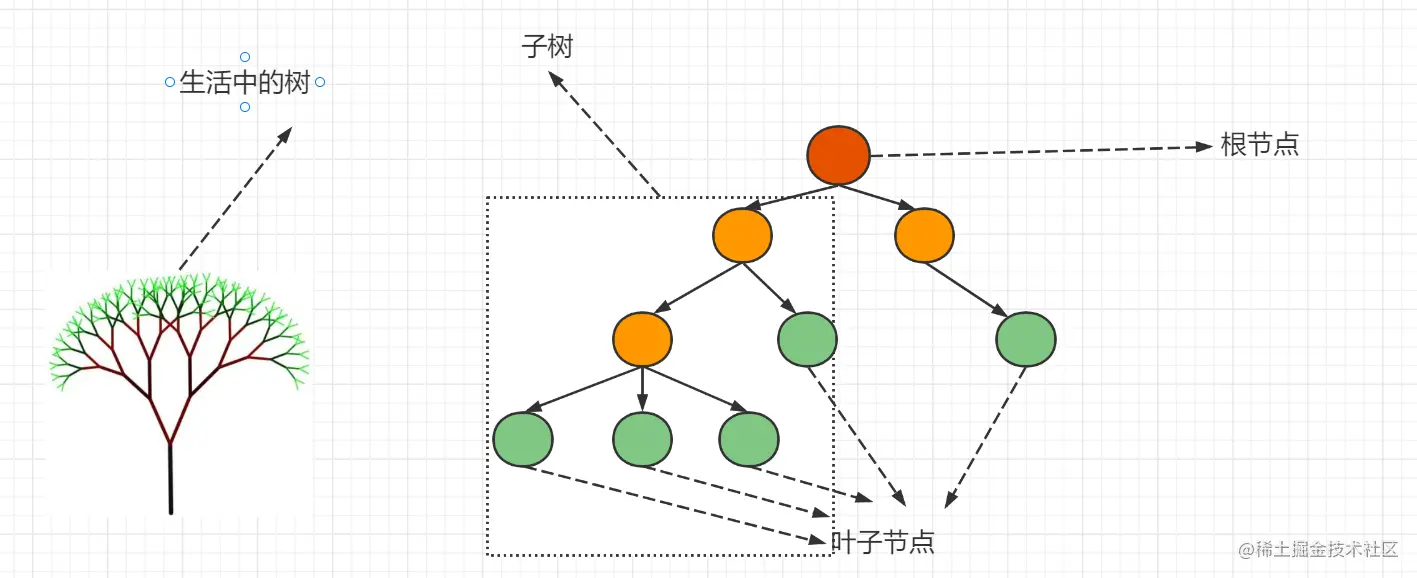 如下图所示,根、子树、叶子节点组成的树形结构。