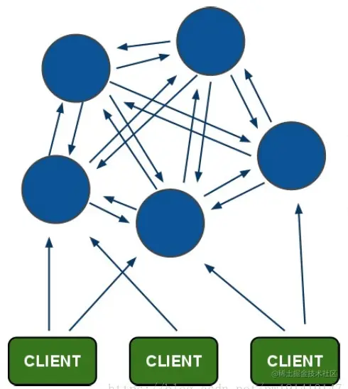- 客户端与redis节点直连,不需要中间proxy层.客户端不需要连接集群所有节点,连接集群中任何一个可用节点即可。