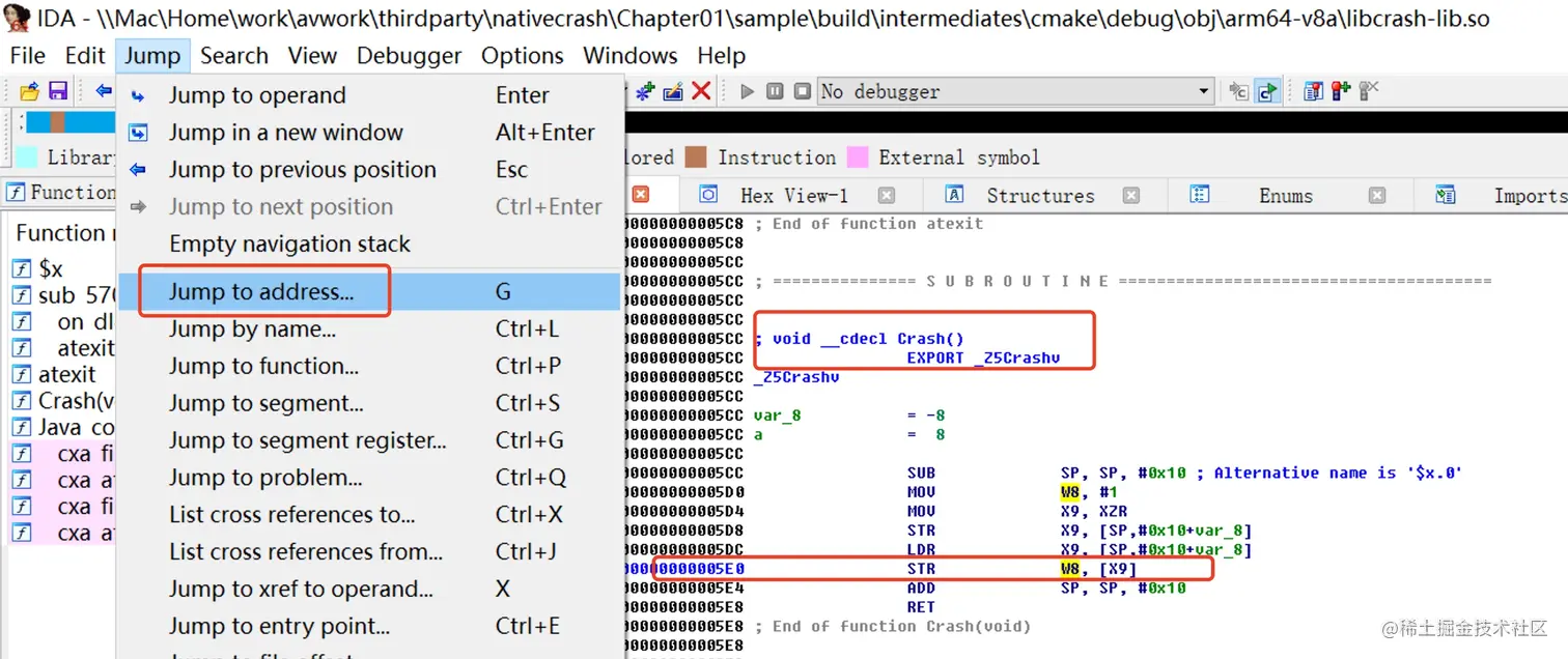 具体驶入如下,我们先用ida打开带符号表的libcrash-lib.so,然后跳转对地址为0x5e0处