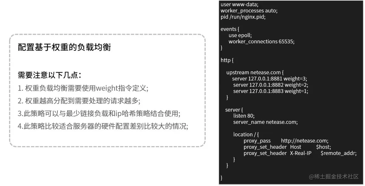 基于权重的负载均衡即Weighted Load Balancing ,这种方式下,我们可以配置Nginx把请求更多地分发到高配置的后端服务器上,把相对较少的请求分发到低配服务器。