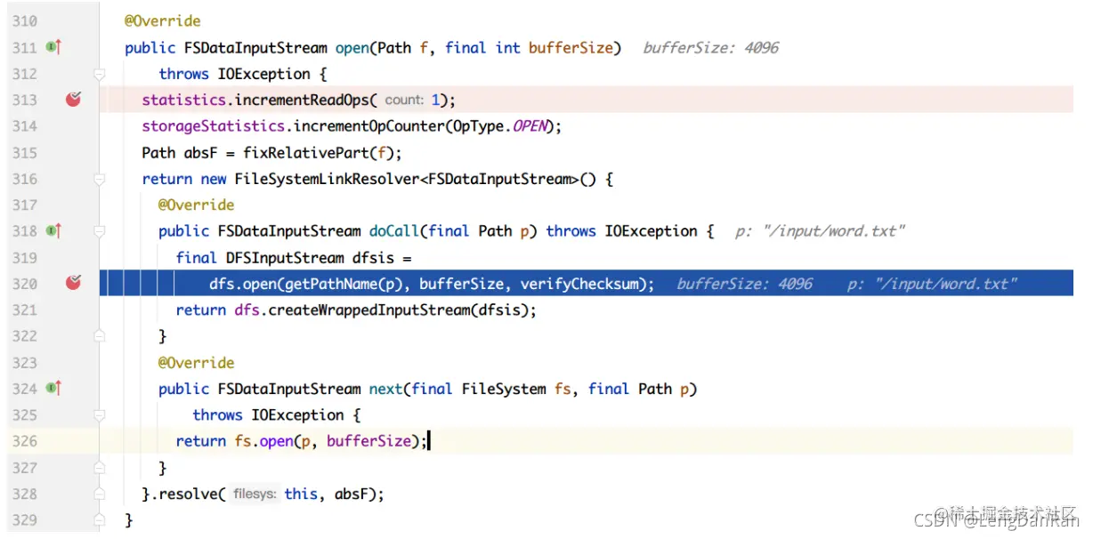 我们一般使用FileSystem来打开HDFS中的一个文件,使用open()方法。