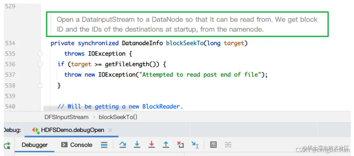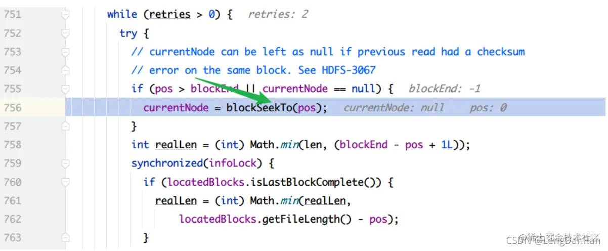 在readWithStrategy中,会调用blockSeekTo()方法,会去寻找当前需要访问的DataNode节点信息。