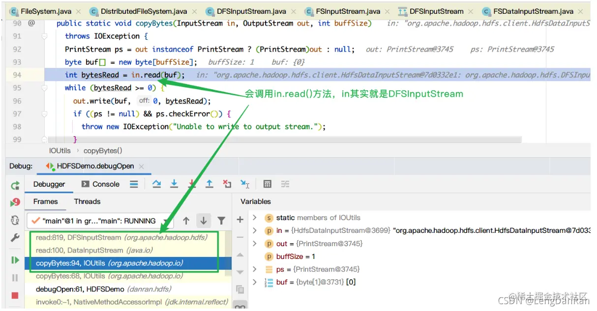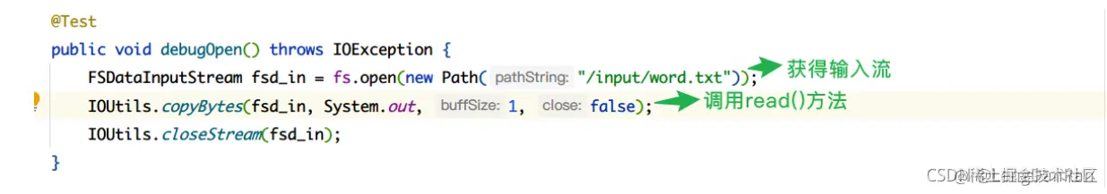 Hadoop提供的IOUtils.copyBytes()方法会去调用输入流中的read()方法,获得数据
