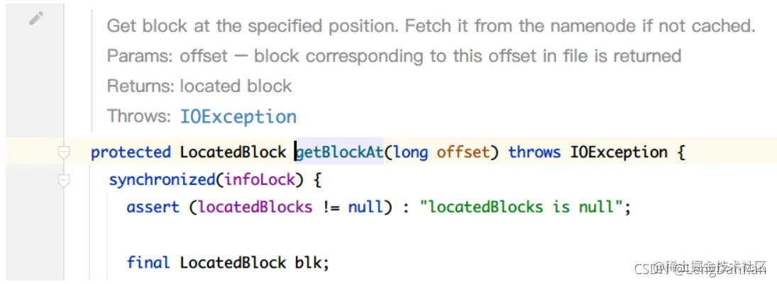 接着会根据偏移量来得到一个目标DataNode,具体的方法为getBlockAt():