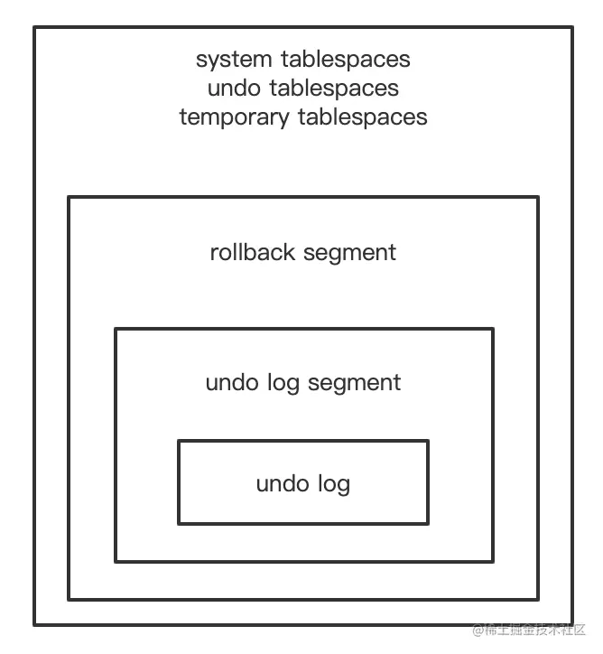 Undo log 存在于 undo log segment 中,undo log segment 存在于 rollback segment,rollback segment 存在于 system tablespace、undo tablespaces 和 temporary tablespaces。