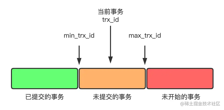 - 落在黄色区域。「min_trx_id < 事务ID < max_trx_id」则与trx_ids匹配。这时候会有三种情况: