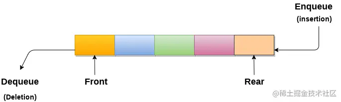 • 队列可以定义为有序列表,它允许在一端执行插入操作,称为REAR,删除操作在另一端执行,称为FRONT。