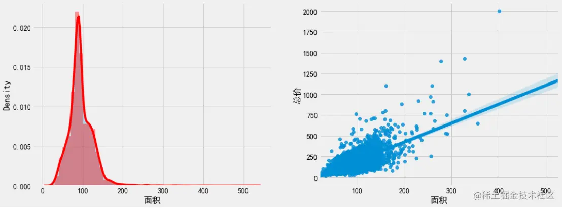 由于 pyecharts 中的散点图不太方便绘制趋势线,我们直接使用 seaborn 来绘制,二手房面积分布及面积与价格的相关性。