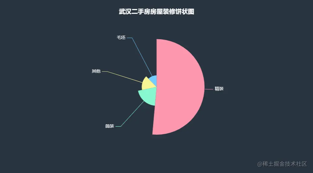 根据图中信息超过一般的二手房是精装,毕竟之前住过人的,再简单装修一下,以更高的价格转手肯定还是很香的,将近 25% 的二手房是简装,剩余少量为其他装修类型和毛坯。毛坯二手房确实数量不多,和预料的差不多。