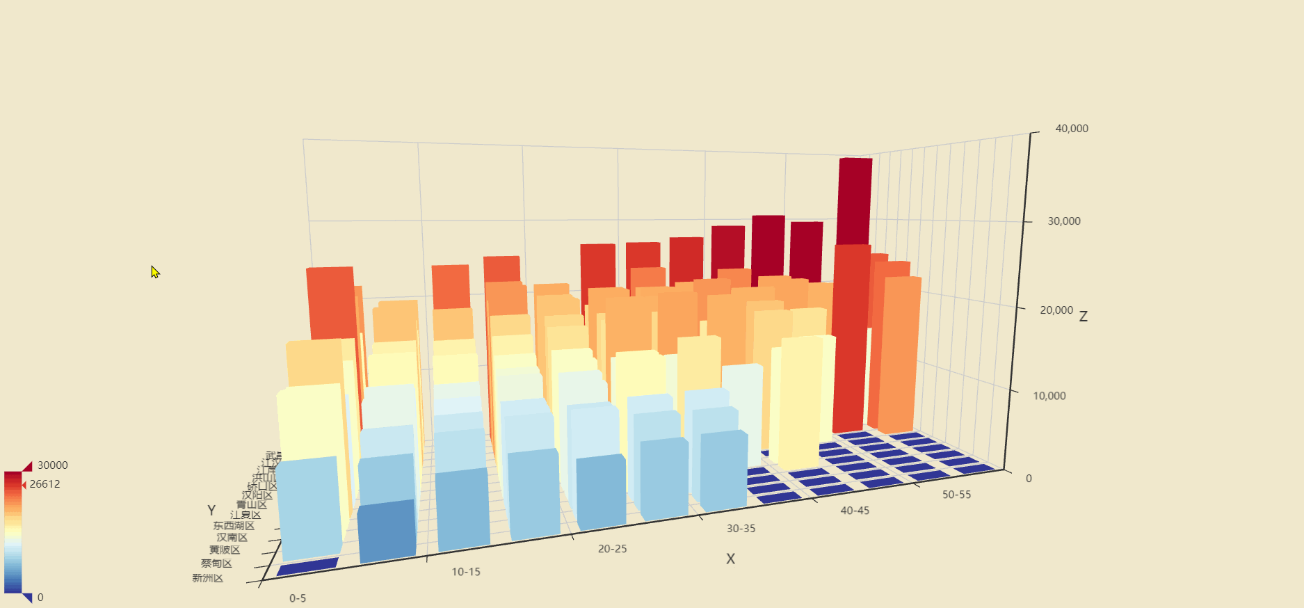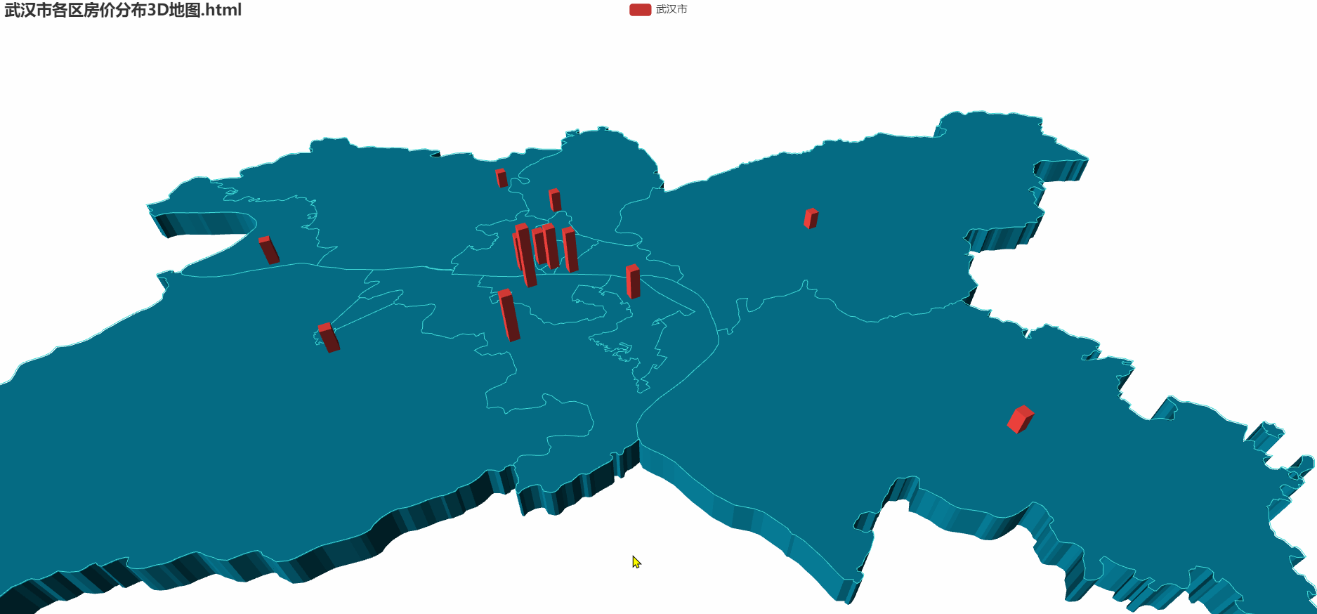 根据地图的信息,房价较高的区域集中在武汉市中心区域,以武昌区为首房价单价为 24600 元/m²。其余中心城市房价也均在 15000 元/m²以上。最低房价为新洲区,房价中位数为 7806 元/m²。下面通过3D地图来观察一下。