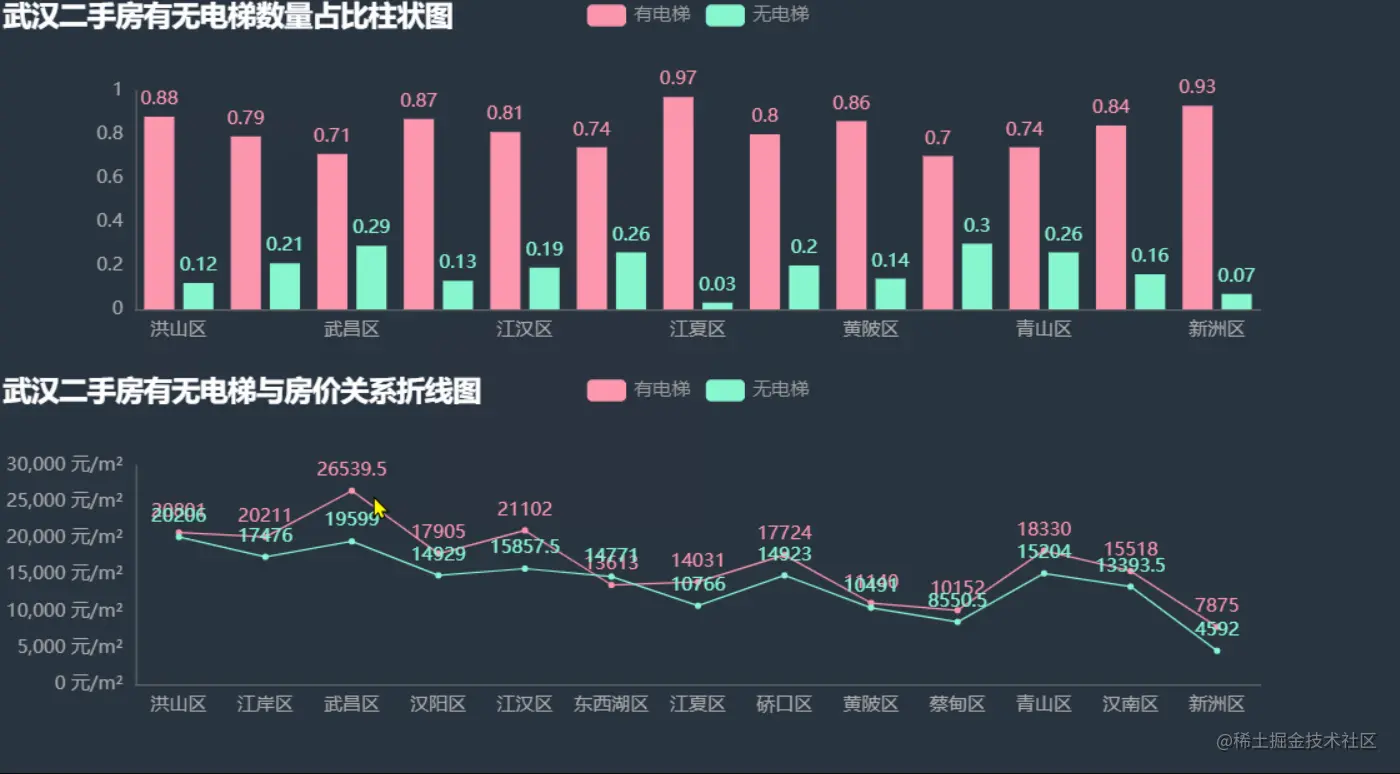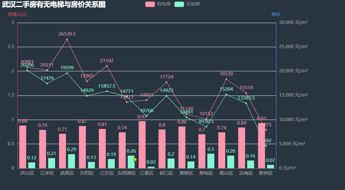根据上图中的信息,各区二手房中有电梯的数量占了绝大多数,除了东西湖区的房价无电梯比有电梯略高外,其余各区的有电梯房价均比无电梯房价要高,其中武昌区差距最明显,这也印证了上面楼层与房价的关系,武昌区由于江景的原因高楼很吃香。图中新洲区的条形图与折线图有部分重叠,我们下面将两个图分开绘制,效果会更好。
