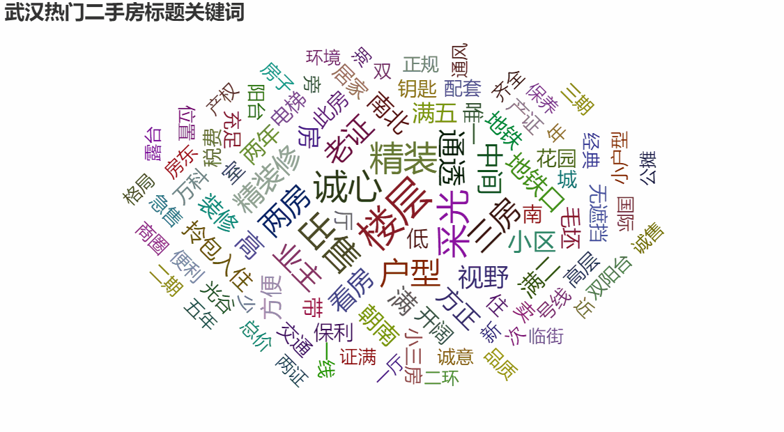热门二手房标题中出现较多的词有:电梯,楼层、采光、精装修、户型、满二、交通等。还有一些与位置相关的词汇,可以通过卖家的这些关键词来作为参考,说不定就是我们之后买房需要注意的内容。