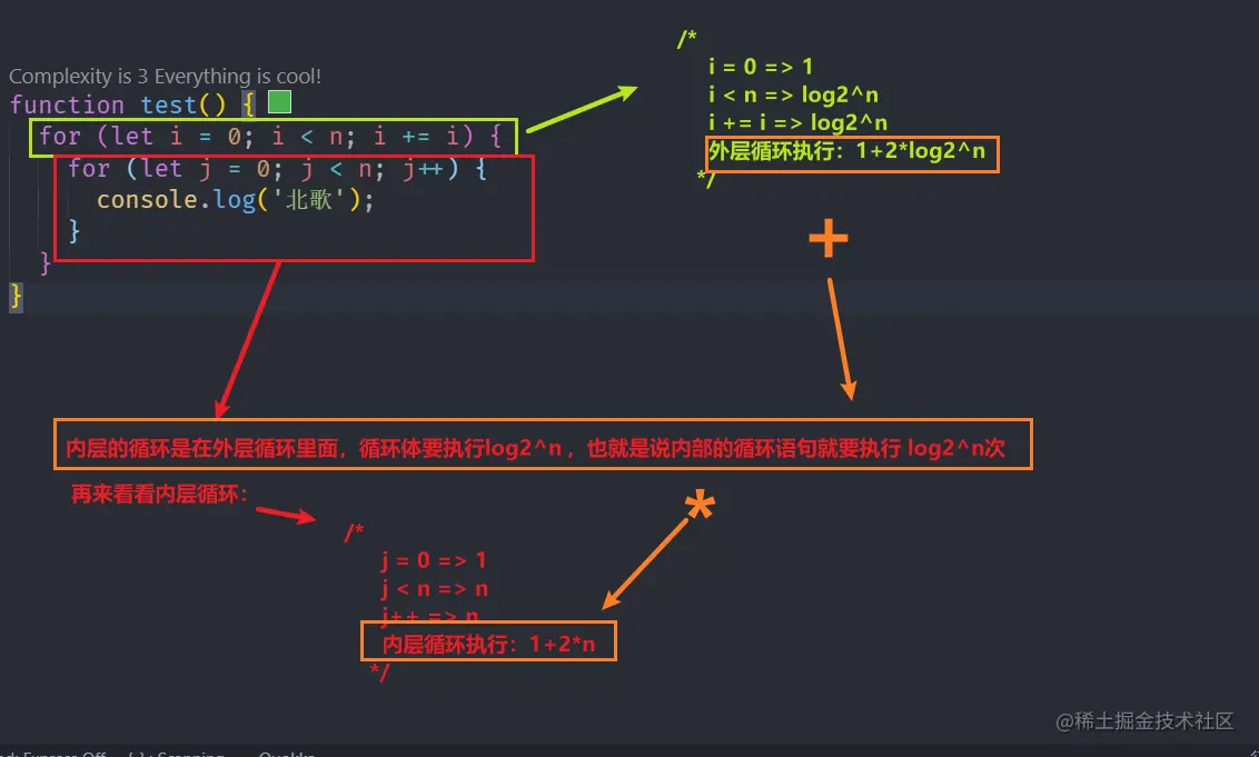 为什么是乘?因为外层的循环体会执行 log2^n次, 里面的循环语句也会执行这么多次