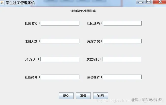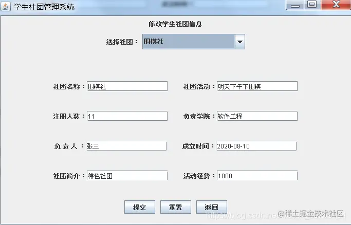 项目是使用Java swing+mysql开发,可实现基础数据维护、用户登录注册、社团信息列表查看、社团信息添加、社团信息修改、社团信息删除以及退出注销等功能、界面设计比较简单易学、适合作为Java课设设计以及学习技术使用。