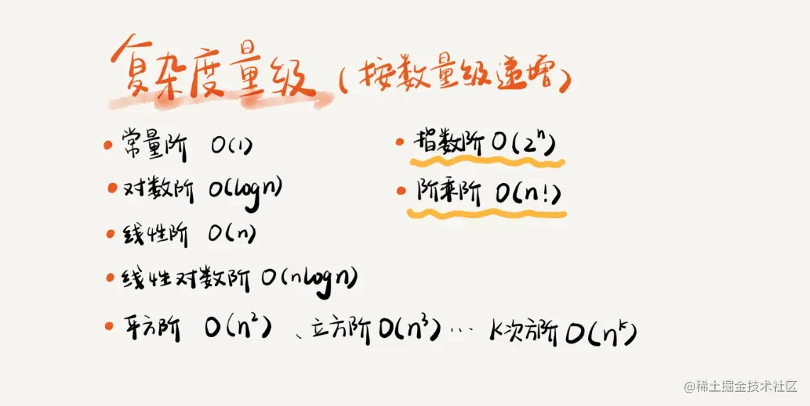 当 n 很大时,可以把它想象成 10000、100000。而公式中的低阶、常量、系数三部分并不左右增长趋势,所以都可以忽略。我只需要记录一个最大量级就可以了。