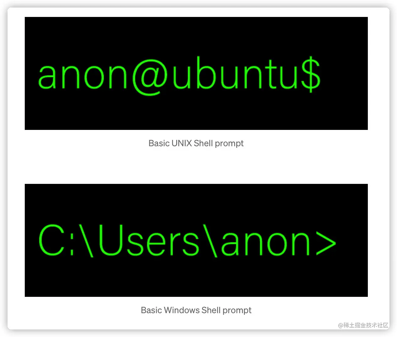 shell 通常是一个命令行界面,它将操作系统的服务暴露给人类使用或其他程序。 在 shell 启动后,shell 通常会通过显示提示来等待用户的输入。 下图描述了基本的 UNIX 和 Windows shell 提示。