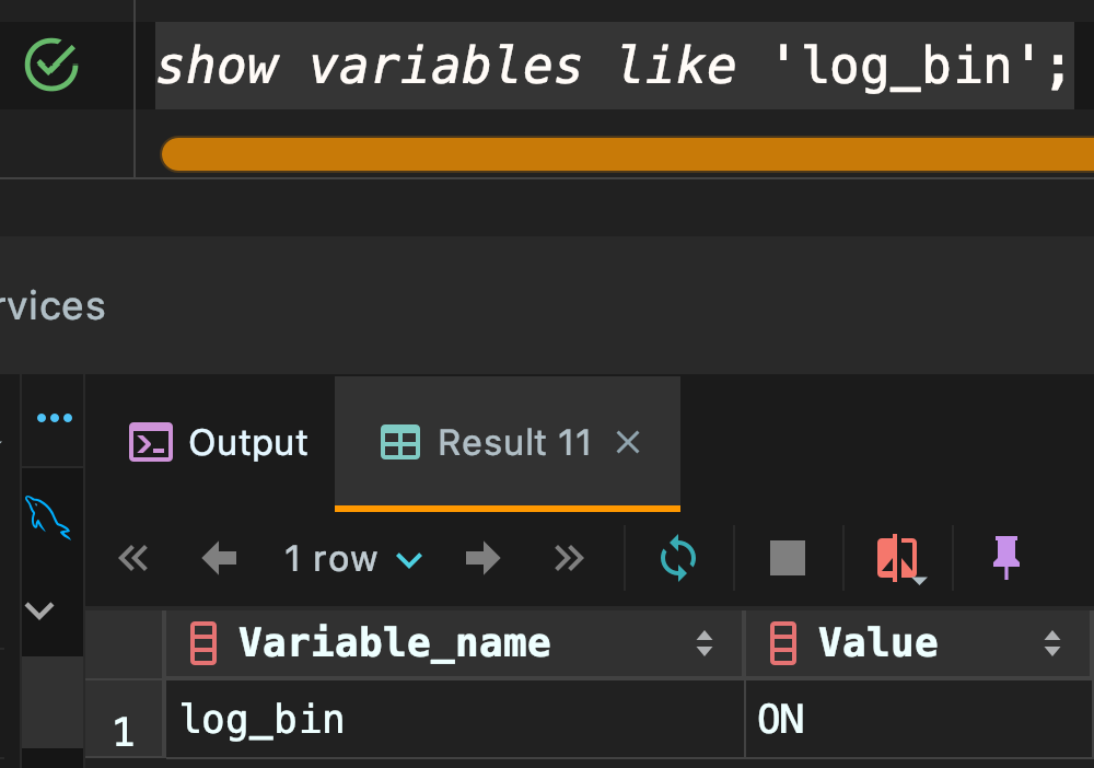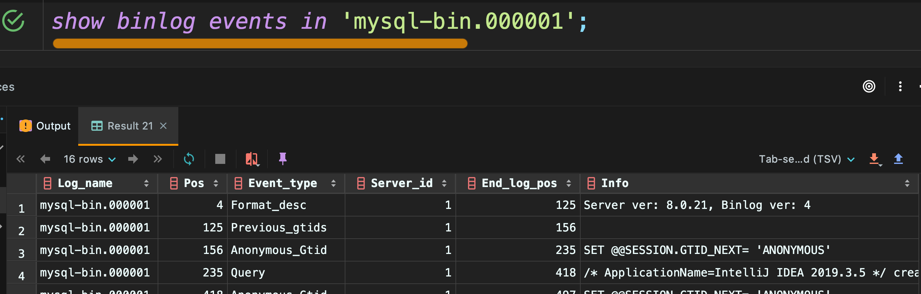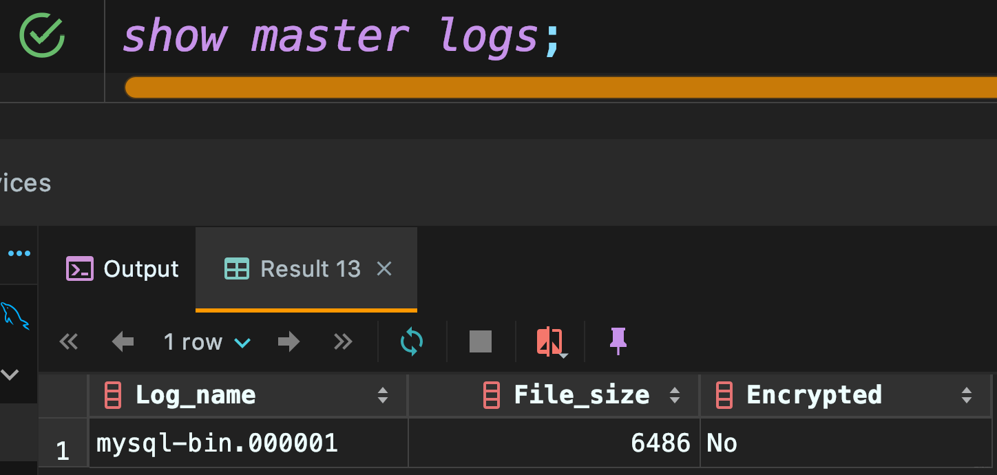 - 查看binlog日志状态。查看最后一个Binlog日志的编号名称,及最后一个事件结束的位置( pos )