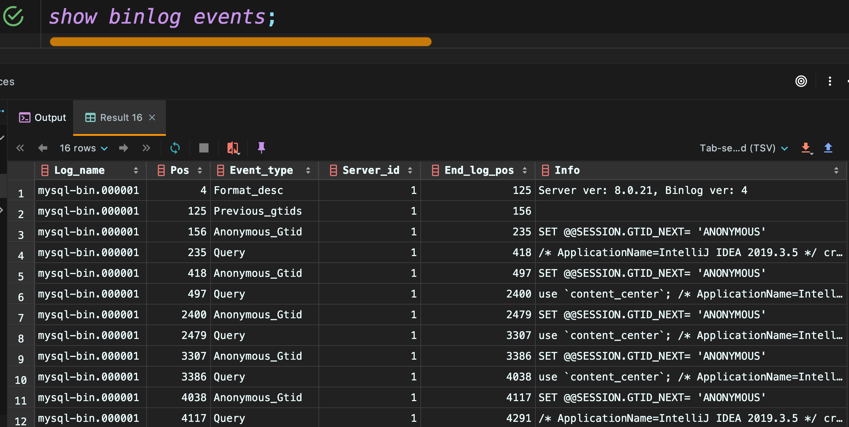 show binlog events [IN 'log_name'] [FROM pos] [LIMIT [offset,] row_count]