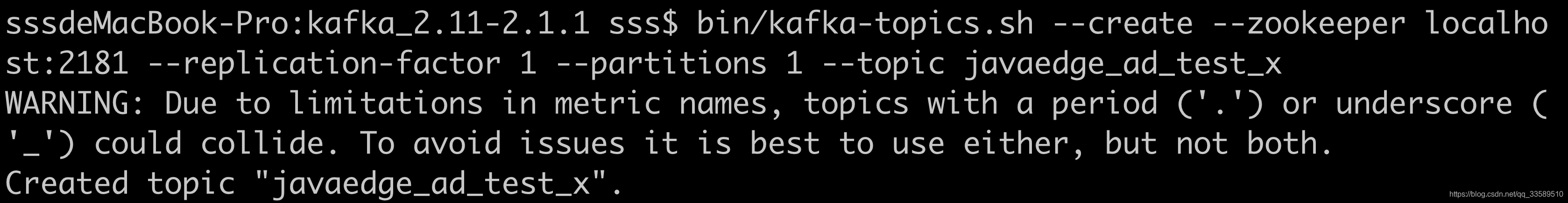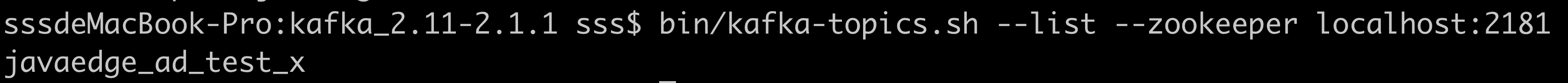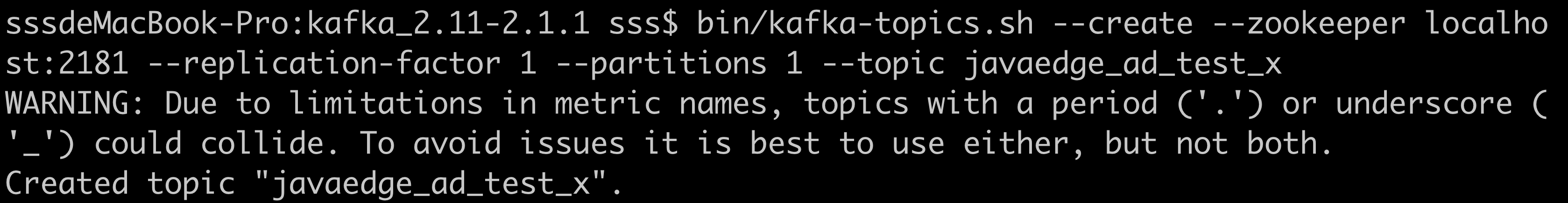 bin/kafka-topics.sh --create --zookeeper localhost:2181 --replication-factor 1 --partitions 1 --topic javaedge_ad_test_x