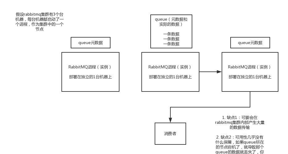 而且如果那个放queue的实例宕机了,会导致接下来其他实例就无法从那个实例拉取,如果你开启了消息持久化,让RabbitMQ落地存储消息的话,消息不一定会丢,得等这个实例恢复了,然后才可以继续从这个queue拉取数据。