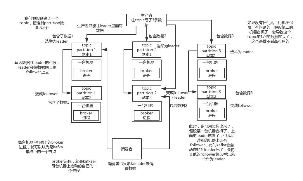 - 每个partition的数据都会同步到其他机器,形成自己的多个replica副本