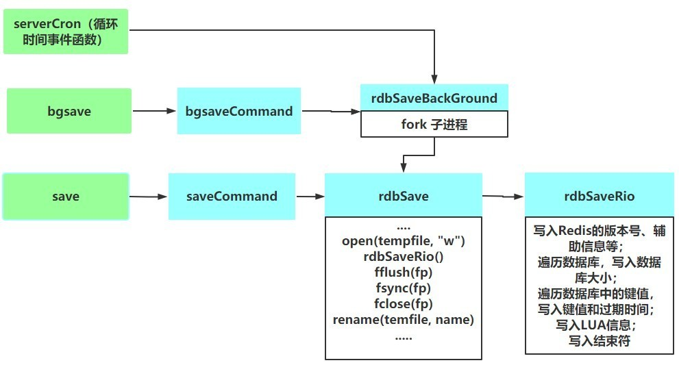 在Redis内部一个定时器事件,每隔固定时间去检查当前数据发生的改变次数与时间是否满足配置的持久化触发的条件,如果满足则通过操作系统fork调用来创建出一个子进程,这个子进程默认会与父进程共享相同的地址空间,这时就可以通过子进程来遍历整个内存来进行存储操作,而主进程则仍然可以提供服务,当有写入时由操作系统按照内存页(page)为单位来进行copy-on-write保证父子进程之间不会互相影响。