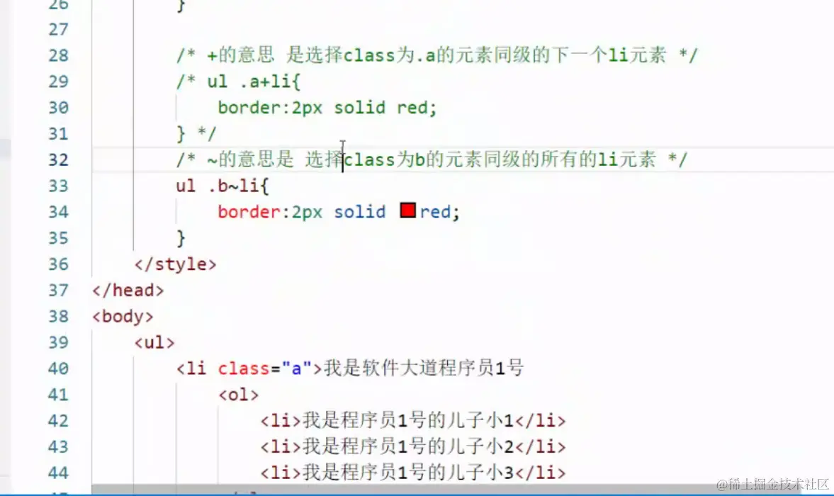 ul .b~li{border:2px solid red}~的意思是选择class为b的元素同级的所有的li元素