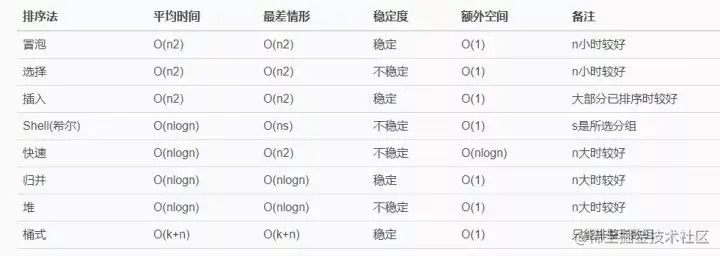 - 下面是一个总的表格,大致总结了我们常见的所有的排序算法的特点。