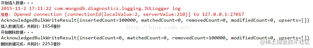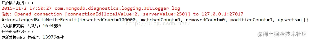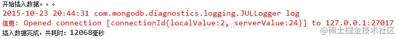 结果:12068毫秒,差距非常大。由此可见,MongoDB批量插入比逐条数据插入效率提高了非常多。