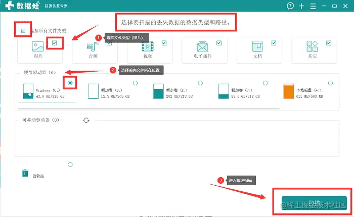 步骤一:搜索数据蛙数据恢复专家软件进行下载和安装,最好不要将数据蛙数据恢复专家软件安装在C盘,影响电脑的运行。接下来就是对文件类型和路径的选择,勾选文件的路径,全选文件的类型有助于全方位的文件扫描。