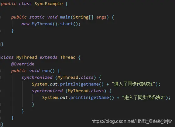 在输出“同步代码块1”之后,不需要等待锁释放,即可进入第二个同步代码块。这样的一个特性可以更好的封装代码(即:同步代码块中的代码,可以分成多个方法来写)。