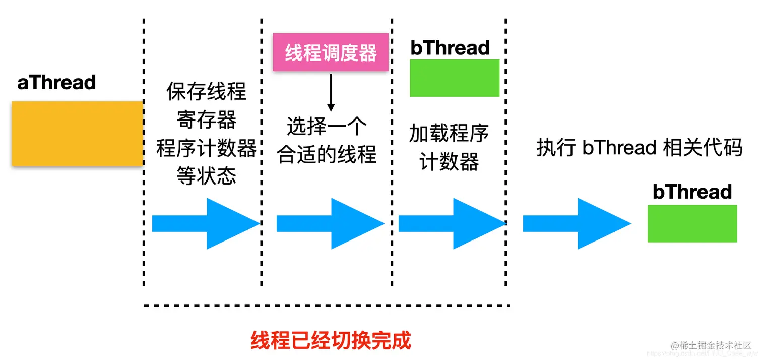 将CPU从一个线程切换到另一线程涉及挂起当前线程,保存其状态,例如寄存器,然后恢复到要切换的线程的状态,加载新的程序计数器。