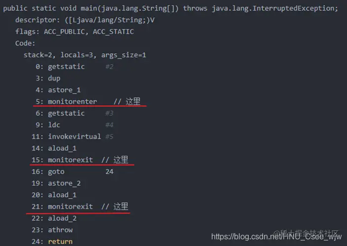 上面编译出来的指令,其实monitoreexit是有两个:需要保证如果同步代码块执行抛出了异常,则也需要释放锁对象。